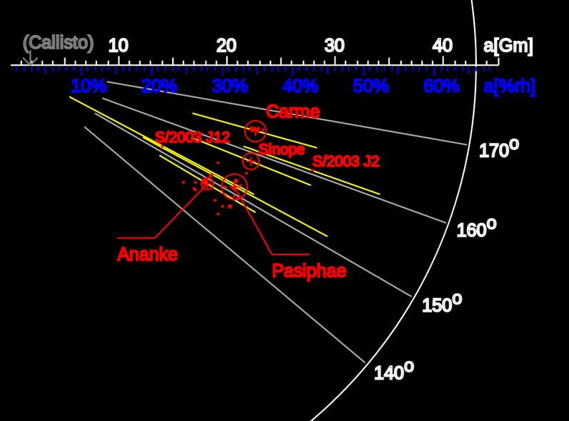 Ananke draait om Jupiter in een retrograde baan met een hoge excentriciteit en een hoge neiging. Sinds 2000 zijn acht onregelmatige satellieten ontdekt die in een baan rond Jupiter draaien en soortgelijke banen volgen. De orbitale elementen zijn vanaf januari 2000. Ze veranderen voortdurend als gevolg van zonne- en planetaire verstoringen. Het diagram illustreert de baan van Ananke in relatie tot andere retrograde onregelmatige satellieten van Jupiter. De excentriciteit van geselecteerde banen wordt weergegeven door de gele segmenten (die zich uitstrekken van het pericentrum tot het apocentrum). De buitenste reguliere satelliet Callisto bevindt zich ter referentie.